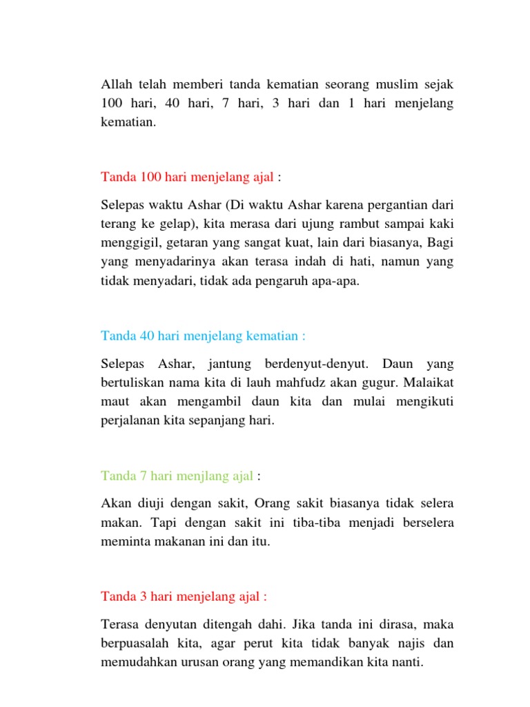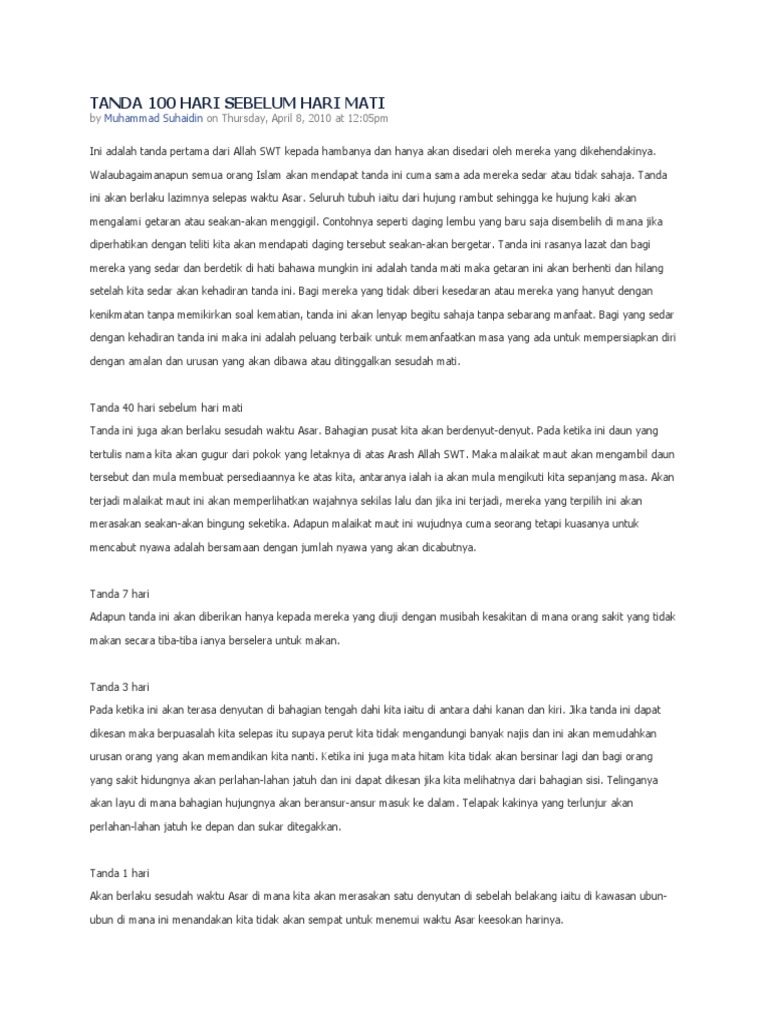 100 Hari Sebelum Kematian from i0.wp.com Jom follow khalifah untuk semua. Ini adalah tanda pertama dari allah swt kepada hambanya dan hanya akan disedari oleh mereka yang dikehendakinya. 100 hari sebelum hari kematian. The latest music videos, short movies, tv shows, funny and extreme videos. Namun semua orang islam akan mendapat tanda ini, hanya apakah mereka sadar atau tidak saja. Tanda 40 hari, 7 hari hingga sehari sebelum kematian | dr khalid basalamah ma ini tanda 40 hari, 7 hari hingga sehari. Ini adalah tanda pertama dari allah swt kepada hambanya dan hanya akan disadari oleh mereka yang 3. Seluruh tubuh dari hujung rambut sehingga ke hujung kaki akan mengalami getaran seakan akan mengigil.