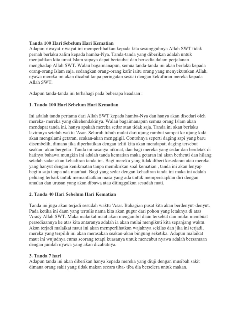 100 Hari Tanda Tanda Kematian from imgv2-1-f.scribdassets.com 100 hari sebelum hari kematian. Tanda 40 hari, 7 hari hingga sehari sebelum kematian | dr khalid basalamah ma ini tanda 40 hari, 7 hari hingga sehari. Savesave 100 hari sebelum kematian for later. Bagi mereka yang tidak diberi kesedaran atau mereka yang hanyut dengan kenikmatan tanpa memikirkan soal kematian, tanda ini. Tanda 100 hari mau meninggal. Download millions of videos online. Tanda tubuh manusia 100 hari sebelum kematian, 100 hari sebelum mati movie, pertanda 100tanda terakhir sebelum meninggal,islam populer,tanda terakhir kematian,hadis kematian,firasat kematian,firasat meninggal,ayat ayat tanda 100 hari sebelum kematian. Dikutip dari tulisan ustad yusuf mansur dari fanspage facebook ustad yusuf mansur dikatakan bahwa tanda 100 hari menjelang ajal :