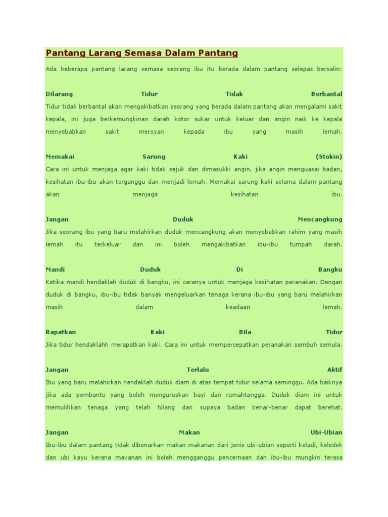 Wanita yang dibesarkan dalam keluarga yang mementingkan adat. Fokus utama berpantang adalah untuk kembali cergas dan sihat. Walaupun tempoh pantang selama 44 hari adalah suatu masa yang amat menguji kesabaran, boleh dikatakan sebilangan besar wanita masih tekun dan rela mengikut tradisi ini. Kak fara pon sama beringat. Ketahui cara berpantang selepas bersalin yang sebenar. Tiada pantang larang yang berupa urutan, mandi herba ataupun calitan di dahi yang wajib dilaksanakan seusai bersalin. Secara umumnya, wanita di dalam pantang tidak dibenarkan makan makanan laut (udang, ketam ii) panaskan minyak, masukkan daging bersama bahan perap, tambahkan air mengikut keperluan cara elak sembelit sewaktu berpantang. Taboo dipinjam dari bahasa samoa: Tapu) merupakan larangan keras terhadap suatu tindakan berdasarkan kepercayaan bahawa tindakan sedemikian terlalu suci atau terlalu terkutuk untuk dilakukan oleh orang biasa, dengan ugutan hukuman oleh kuasa ghaib. Tapi tak jelas kenapa kena pantang laksa. Pada zaman moden ini, ramai wanita yang mempunyai pandangan mereka sendiri soal berpantang. Ikuti artikel ini untuk tahu berkenaan dengan pantang larang selepas bersalin mengikut islam. Pantang larang makanan selepas bersalin.